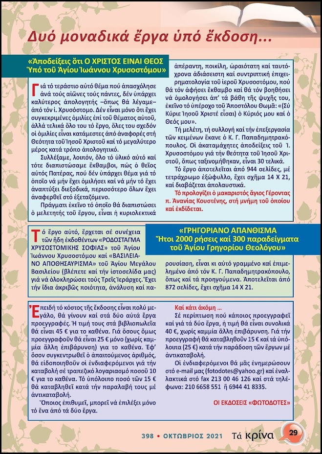 Δυό μοναδικά καὶ πολυσέλιδα ἔργα ὑπό ἔκδοση...